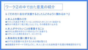 出た意見は「本人との関わり方」「本人がやりたいことを尊重すること」「具体的な支援に関すること」の大きく分けて3つにカテゴライズされました。出た意見の紹介は下記に添付した画像にてご紹介します。