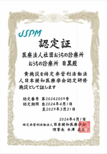 目黒区では、東邦大学医療センター大橋病院、東京医療センター、おうちの診療所 目黒の3件が認定されており、当院は目黒区唯一の診療所での認定となります。